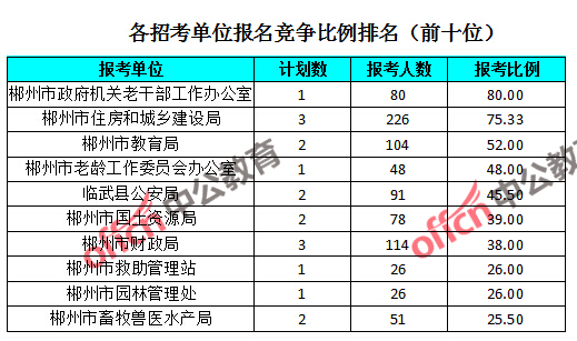 競(jìng)爭(zhēng)熱門(mén)招考單位,前三位依次是:郴州市政府機(jī)關(guān)老干部工作辦公室(競(jìng)爭(zhēng)比例80:1)、郴州市住房和城鄉(xiāng)建設(shè)局(競(jìng)爭(zhēng)比例75.33:1)和郴州市教育局(競(jìng)爭(zhēng)比例52:1)。