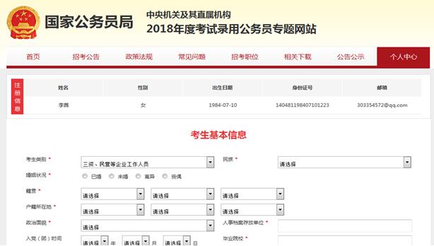 考生可以在注冊(cè)完成之后立馬去完善個(gè)人信息,也可以在選報(bào)之后去完善個(gè)人信息,考生填寫基本信息的界面如下: