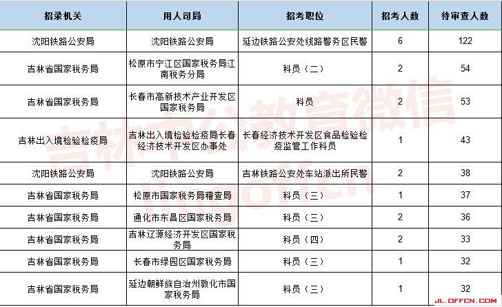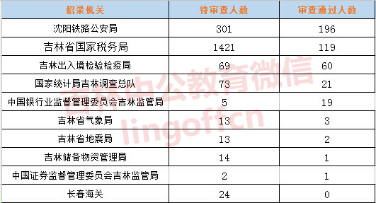 報(bào)名通過審核人數(shù)前十的職位主要集中在吉林省國家稅務(wù)局、吉林出入境檢驗(yàn)檢疫局、沈陽鐵路公安局等部門,具體信息如下: