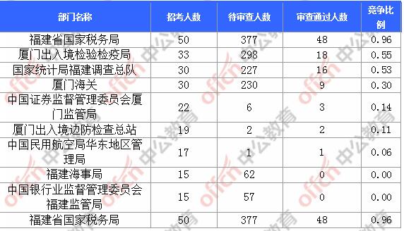 截止到30日18時(shí),通過審核人數(shù)前三位的部門依次是:福建省國家稅務(wù)局、廈門出入境檢驗(yàn)檢疫局、國家統(tǒng)計(jì)局福建調(diào)查總隊(duì),三部門通過審核總?cè)藬?shù)達(dá)82人,占通過審核總?cè)藬?shù)的84.53%。