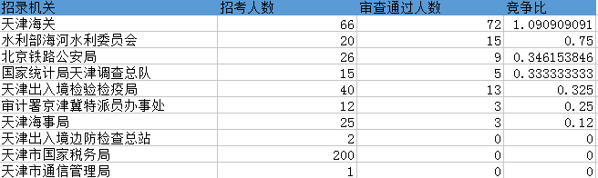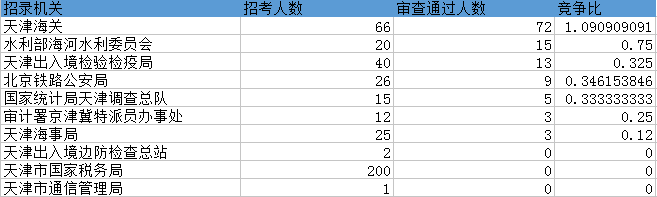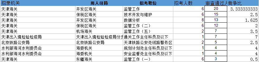 報(bào)名通過(guò)審核人數(shù)前十的職位主要集中在天津海關(guān)、水利部海河水利委員會(huì)等部門,具體信息如下: