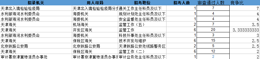 截止到30日18時(shí),競(jìng)爭(zhēng)比例的職位為天津出入境檢驗(yàn)檢疫局的工作主任科員及以下,招錄1人,截止到30日18時(shí)通過(guò)人數(shù)為7人。