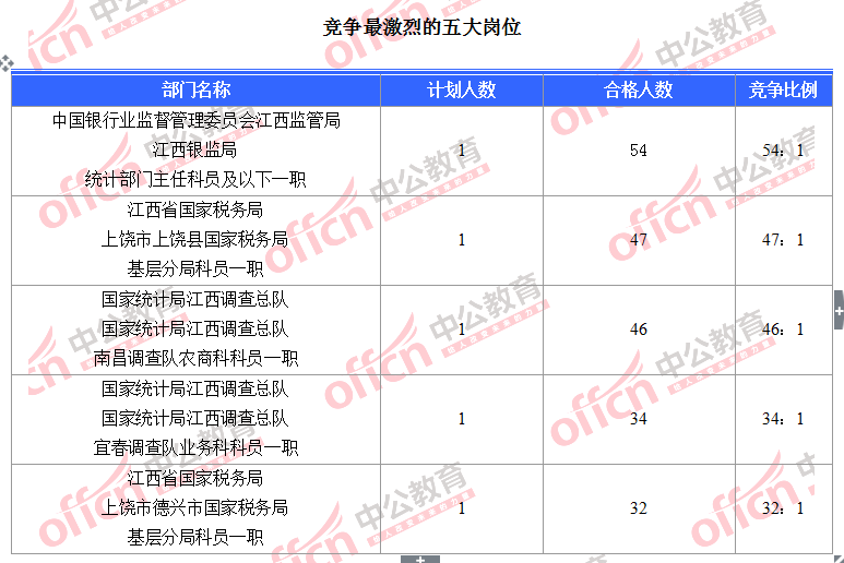 截止到31日18時,競爭比例的職位為中國銀行業(yè)監(jiān)督管理委員會江西監(jiān)管局江西銀監(jiān)局統(tǒng)計部門主任科員及以下一職,招錄1人,截止到31日18時通過人數(shù)為54人,之后的報名情況請隨時關(guān)注中公網(wǎng)校微信。