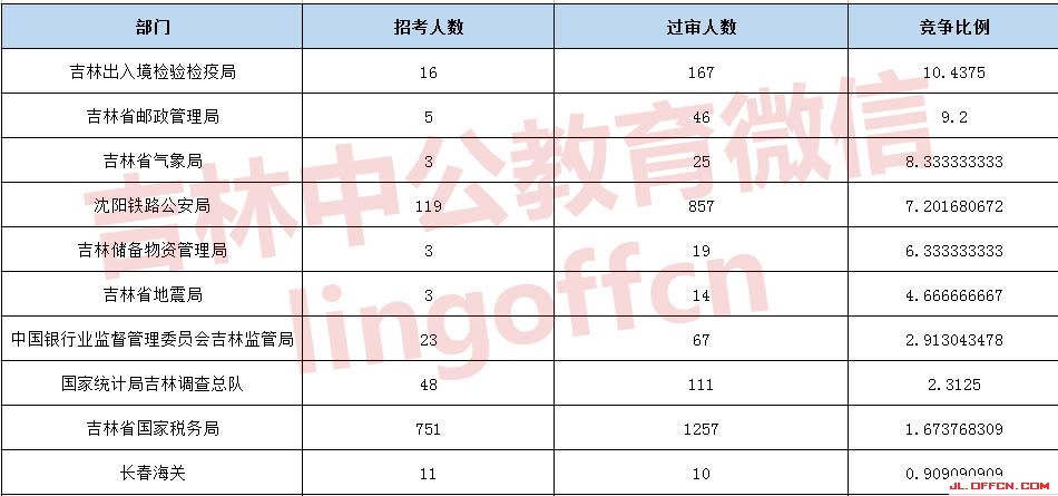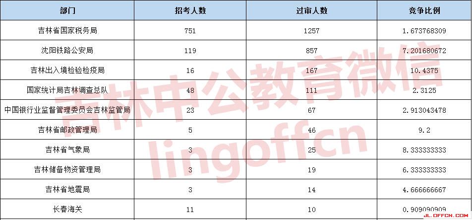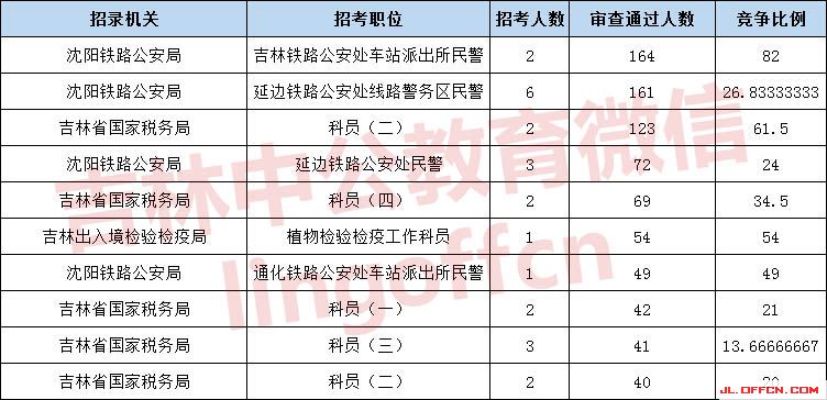 報名通過審核人數(shù)前十的職位主要集中在沈陽鐵路公安局、吉林國家稅務(wù)局、吉林出入境檢疫檢驗(yàn)局等部門,具體信息如下:
