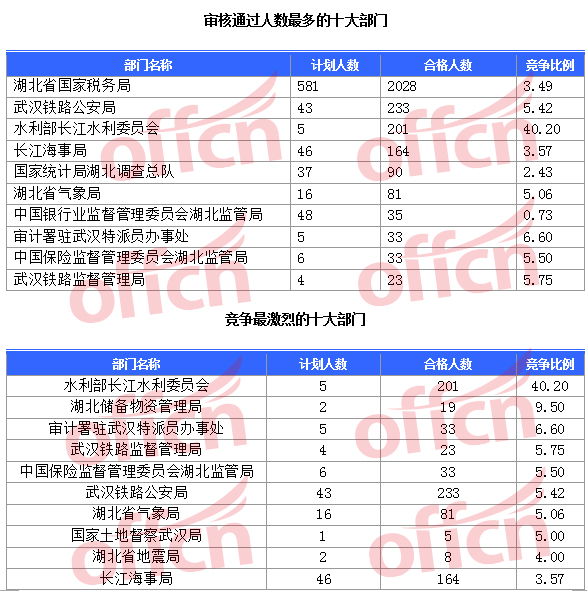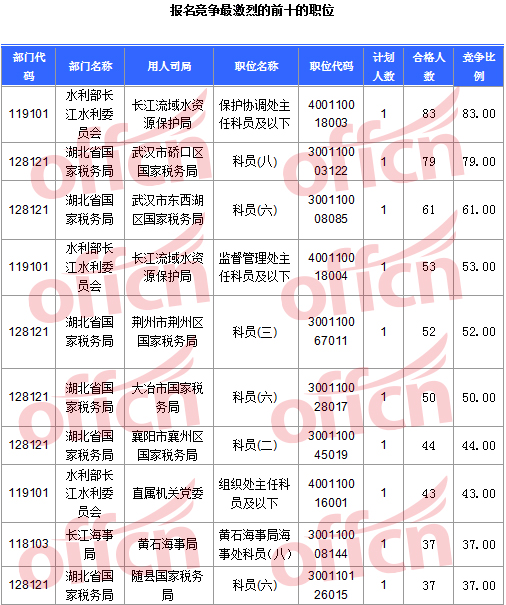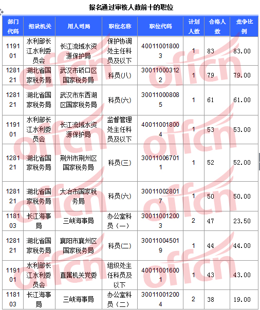 報(bào)名通過審核人數(shù)前十的職位主要集中在水利部長江水利委員會、湖北省國家稅務(wù)局、長江海事局等部門,具體信息如下: