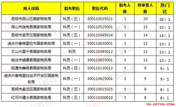 10月31日國考報名第二天,2018國家公務(wù)員考試網(wǎng)絡(luò)報名之際,相比其他部門招考云南省國稅招考人數(shù)相較多,中公網(wǎng)校整理了國考云南省國家稅務(wù)局崗位報名人數(shù)分析如下: