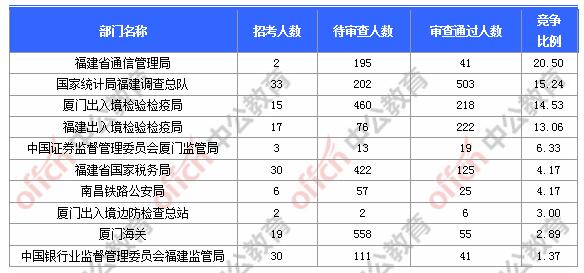 為幫助廣大考生更清晰的了解今日報名情況,中公網(wǎng)校專家整理了審核通過人數(shù)前十位的部門以及競爭比例最激烈的十大部門,供廣大考生參考: