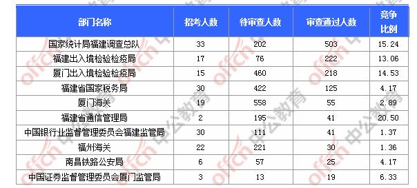 截止到1日9時,通過審核人數(shù)前三位的部門依次是:國家統(tǒng)計局福建調(diào)查總隊、福建出入境檢驗檢疫局、廈門出入境檢驗檢疫局,三部門通過審核總?cè)藬?shù)達(dá)943人,占通過審核總?cè)藬?shù)的72.4%。
