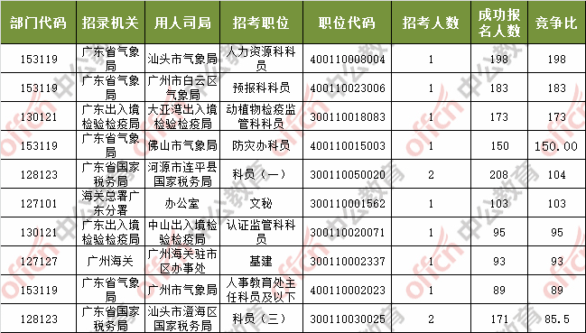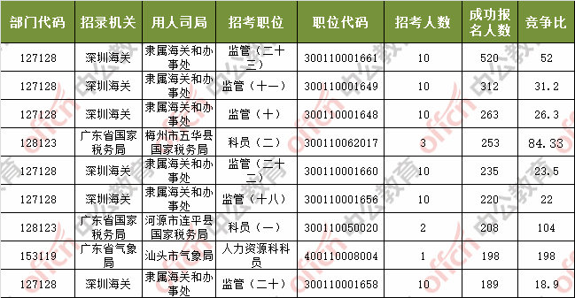 報名通過審核人數(shù)前十的職位主要集中在深圳海關、廣東省國家稅務局、廣東省氣象局等部門,具體信息如下: