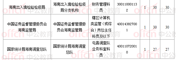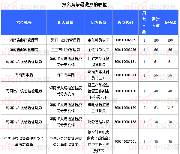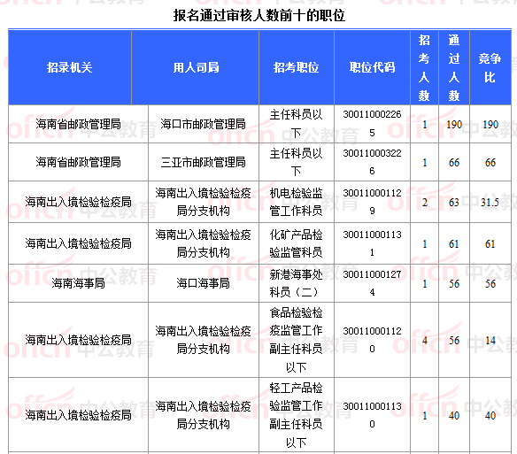 報名通過審核人數(shù)前十的職位主要集中在海南省郵政管理局、海南出入境檢驗(yàn)檢疫局、海南海事局等部門,具體信息如下: