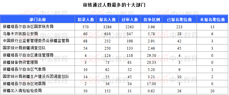 截止到11月1日16時,通過審核人數(shù)前三位的部門依次是:新疆維吾爾自治區(qū)國家稅務(wù)局、烏魯木齊鐵路公安局、中國銀行業(yè)監(jiān)督管理委員會新疆監(jiān)管局,三部門通過審核總?cè)藬?shù)達(dá)2808人,占通過審核總?cè)藬?shù)的82.8%。