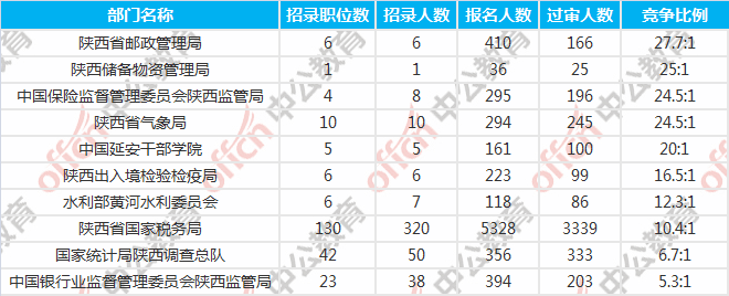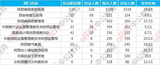 截至到2日9時(shí),通過審核人數(shù)前三位的部門依次是:陜西省國家稅務(wù)局、西安鐵路公安局、國家統(tǒng)計(jì)局陜西調(diào)查總隊(duì),三部門通過審核總?cè)藬?shù)達(dá)4006人,占通過審核總?cè)藬?shù)的76.6%?! ∫?、各部門報(bào)名人數(shù)分析
