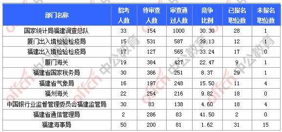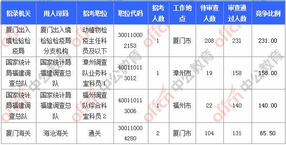 報名通過審核人數(shù)前十的職位主要集中在廈門出入境檢驗檢疫局、國家統(tǒng)計局福建調(diào)查總隊、廈門海關等部門,具體信息如下: