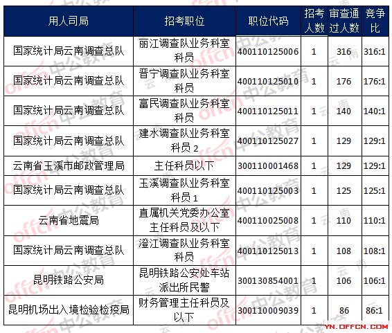 當(dāng)前最受歡迎的崗位是國(guó)家統(tǒng)計(jì)局云南調(diào)查總隊(duì),麗江調(diào)查隊(duì)業(yè)務(wù)科室科員,職位代碼:400110125006