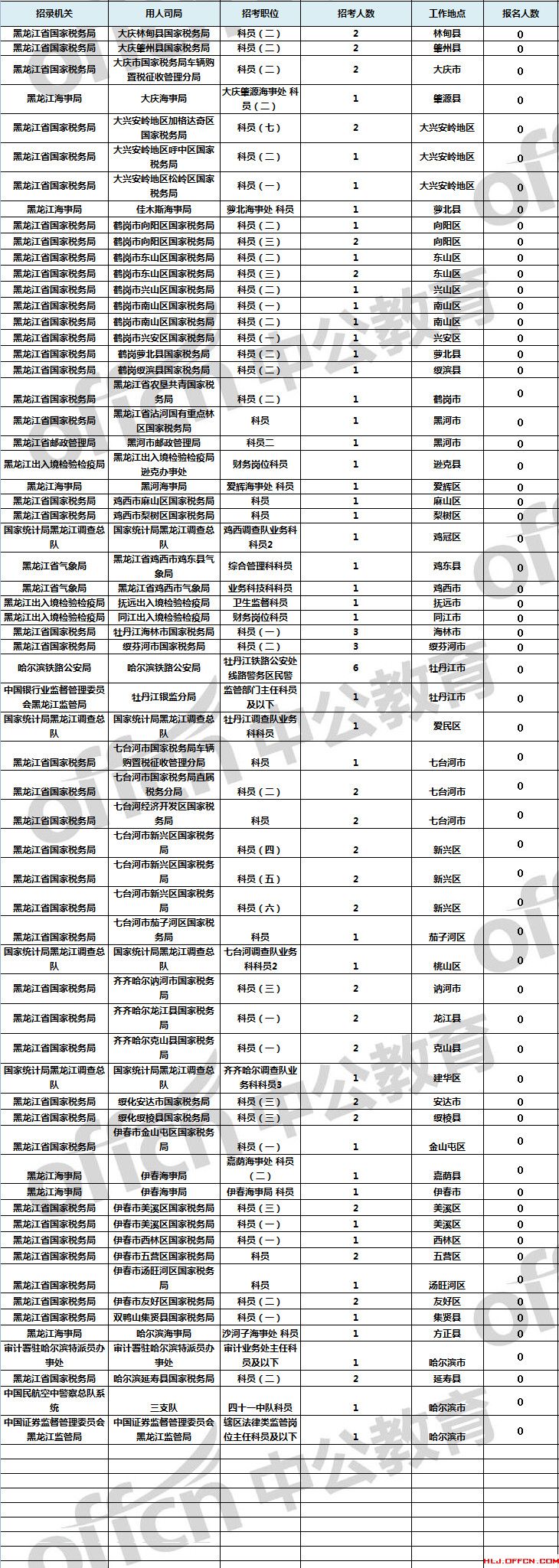 截止到2日16時,工作地點(diǎn)在黑龍江的職位共有124個無人通過審核,占全部職位的19.2%;64個職位無人報考,占全部職位的9.9%。下面是無人報考職位一覽表,中公教育專家建議廣大考生多關(guān)注一些較冷職位,避免激烈競爭,結(jié)合自身條件,找到屬于自己的職位。