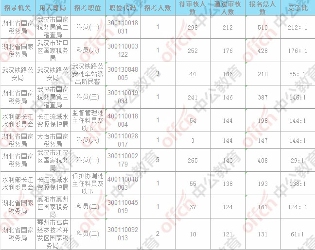報名通過審核人數(shù)前十的職位主要集中在湖北省國家稅務(wù)局、武漢鐵路公安局等部門,具體信息如下: