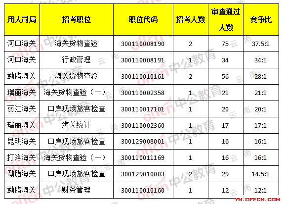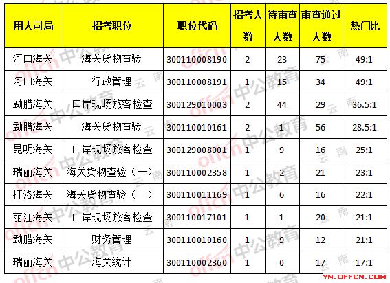 當(dāng)前河口海關(guān)海關(guān)貨物查驗(yàn),職位代碼300110008190的崗位相比報(bào)名人數(shù)為多,招2人,23人報(bào)名待審,75人過審,熱門比為:49:1