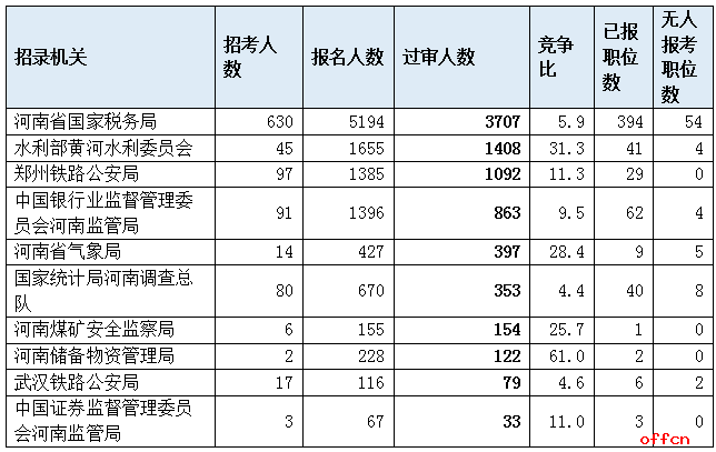 為幫助廣大考生更清晰的了解今日?qǐng)?bào)名情況,中公網(wǎng)校整理了審核通過(guò)人數(shù)前十位的部門(mén)以及競(jìng)爭(zhēng)比例最激烈的十大部門(mén),供廣大考生參考: