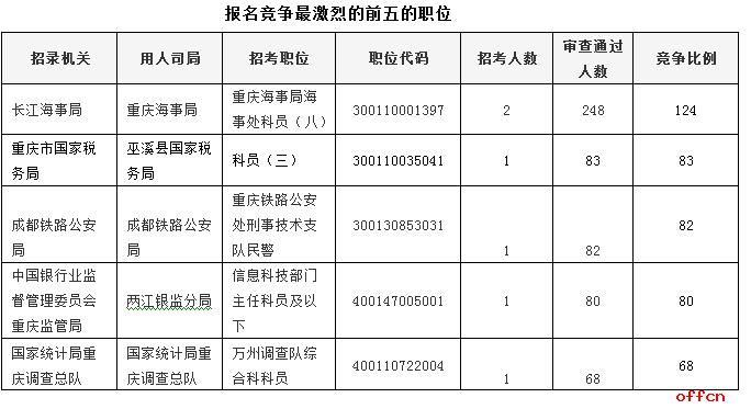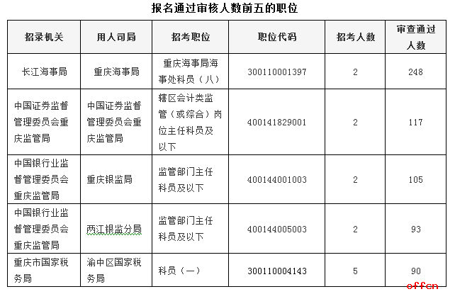 報(bào)名通過(guò)審核人數(shù)前五的職位主要集中在中國(guó)銀行業(yè)監(jiān)督管理委員會(huì)重慶監(jiān)管局、長(zhǎng)江海事局、重慶市國(guó)家稅務(wù)局等部門(mén),具體信息如下:
