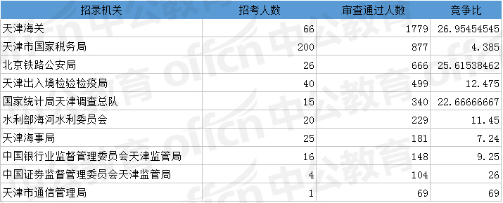 為幫助廣大考生更清晰的了解今日報(bào)名情況,中公網(wǎng)校整理了審核通過人數(shù)前十位的部門以及競爭比例最激烈的十大部門,供廣大考生參考: