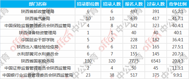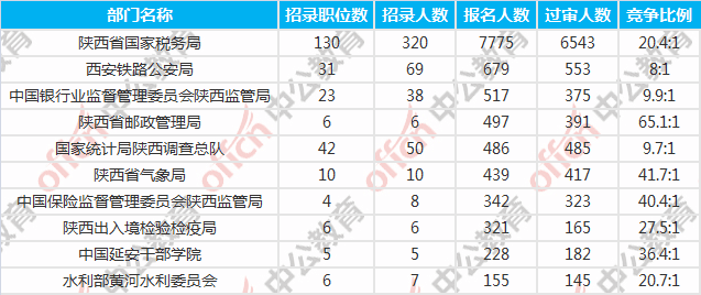 為幫助廣大考生更清晰的了解今日?qǐng)?bào)名情況,陜西中公網(wǎng)校整理了報(bào)名人數(shù)前十位的部門(mén)以及競(jìng)爭(zhēng)比例最激烈的十大部門(mén),供廣大考生參考: