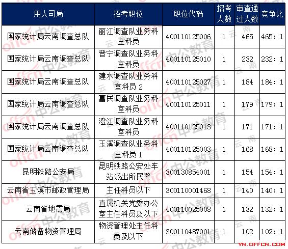 當(dāng)前最受歡迎的崗位是國(guó)家統(tǒng)計(jì)局云南調(diào)查總隊(duì),麗江調(diào)查隊(duì)業(yè)務(wù)科室科員,職位代碼:400110125006