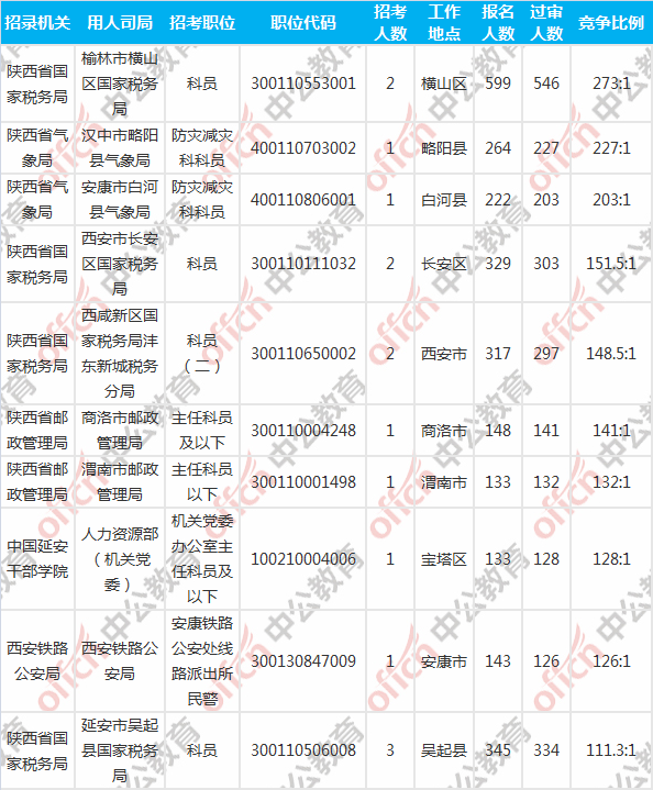 陜西國(guó)考報(bào)名競(jìng)爭(zhēng)最激烈的前十職位