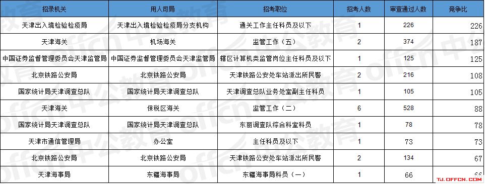 報名通過審核人數(shù)前十的職位主要集中在天津海關(guān)、北京鐵路公安局、天津出入境檢驗檢疫局等部門,具體信息如下: