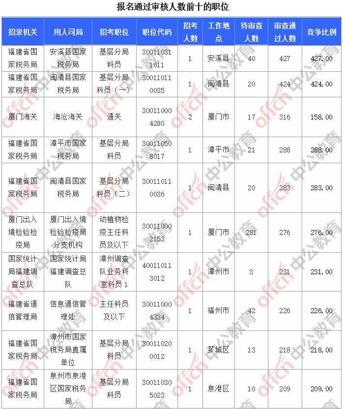 報(bào)名通過審核人數(shù)前十的職位主要集中在福建省國家稅務(wù)局、廈門海關(guān)、廈門出入境檢驗(yàn)檢疫局等部門,具體信息如下: