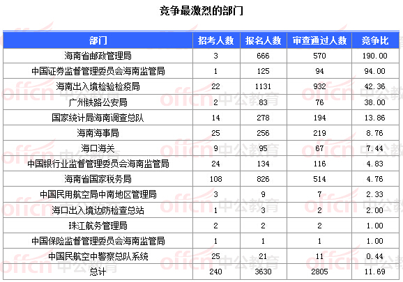 為幫助廣大考生更清晰的了解今日報名情況,中公網(wǎng)校整理了審核通過人數(shù)的部門以及競爭比例最激烈的部門,供廣大考生參考: