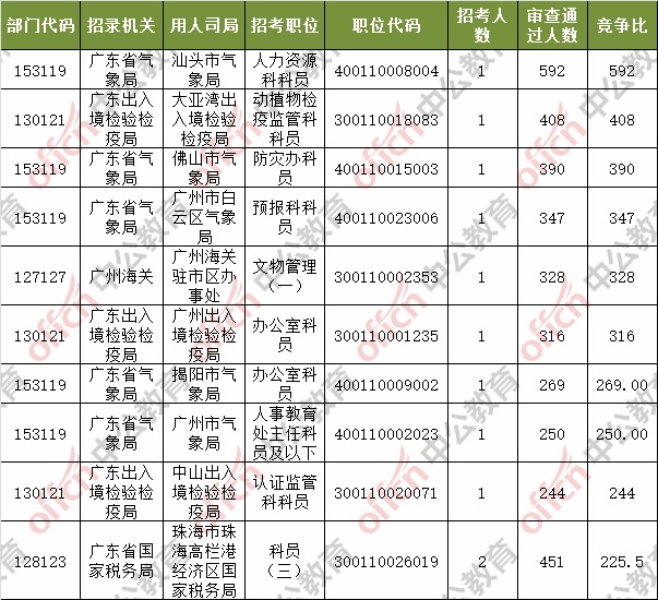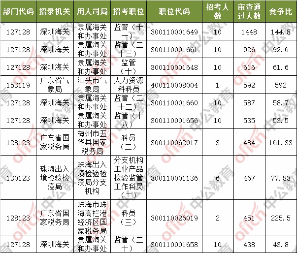 報名通過審核人數(shù)前十的職位主要集中在深圳海關(guān)、廣東省氣象局、廣東省國家稅務局等部門,具體信息如下: