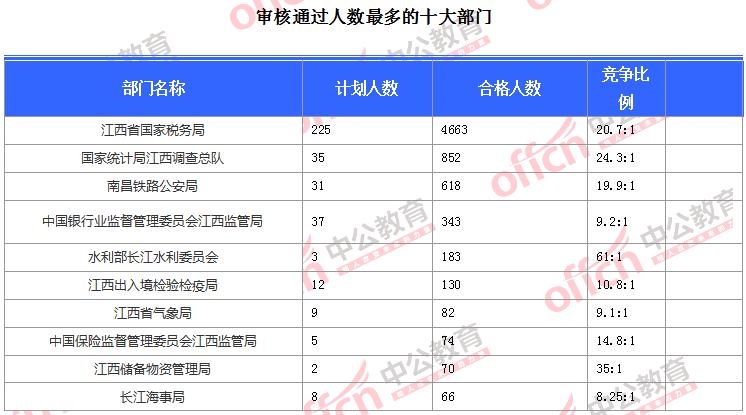 截止到4日16時,通過審核人數(shù)前三位的部門依次是:江西省國家稅務(wù)局、國家統(tǒng)計局江西調(diào)查總隊、南昌鐵路公安局,三部門通過審核總?cè)藬?shù)達6133人,占通過審核總?cè)藬?shù)的85.2%。