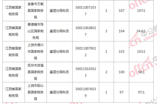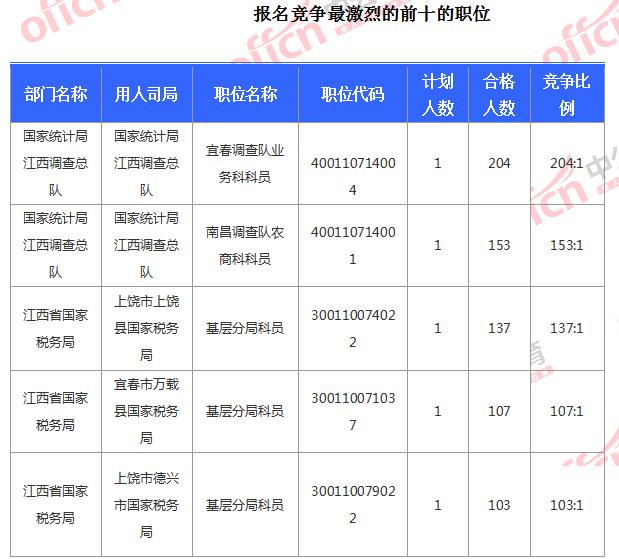 截止到4日16時,競爭比例的職位為國家統(tǒng)計局江西調(diào)查總隊國家統(tǒng)計局江西調(diào)查總隊宜春調(diào)查隊業(yè)務(wù)科科員一職,招錄1人,截止到4日16時通過人數(shù)為204人,位列第二的國家統(tǒng)計局江西調(diào)查總隊國家統(tǒng)計局江西調(diào)查總隊南昌調(diào)查隊農(nóng)商科科員一職,為153:1