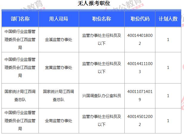 截止到4日16時,工作地點在江西的職位只有4個無人報考,僅占全部職位的1.3%。下面是無人報考職位一覽表,中公網(wǎng)校專家建議廣大考生多關(guān)注一些較冷職位,避免激烈競爭,結(jié)合自身條件,找到屬于自己的職位。