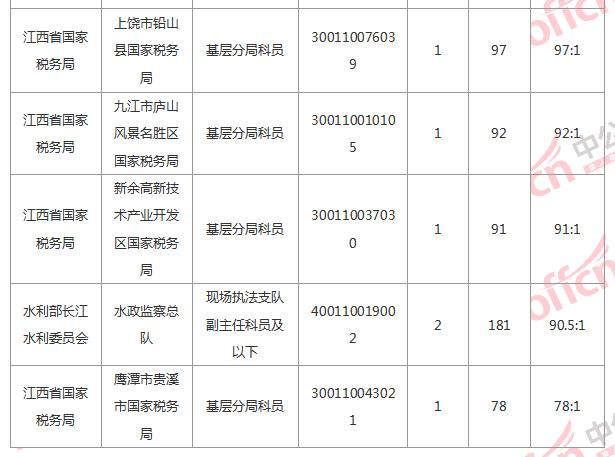 截至11月4日16時,據(jù)中公網(wǎng)校統(tǒng)計,國考職位中工作地點在江西的職位報名人數(shù)為8442人,通過審核總?cè)藬?shù)為7197人,共有4個職位無人通過審核,平均競爭比例為19.2:1。