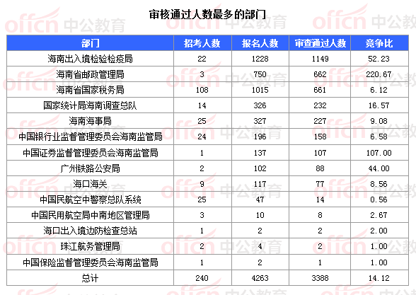 截止到5日16時,通過審核人數(shù)前三位的部門依次是:海南出入境檢驗檢疫局、海南省郵政管理局、海南省國家稅務(wù)局,三部門通過審核總?cè)藬?shù)達(dá)2472人,占通過審核總?cè)藬?shù)的72.96%。