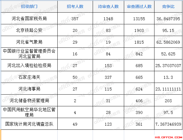報(bào)名通過審核人數(shù)前十的職位主要集中在河北省氣象局、北京鐵路公安局、中國(guó)民用航空局華北地區(qū)管理局等部門,具體信息如下: