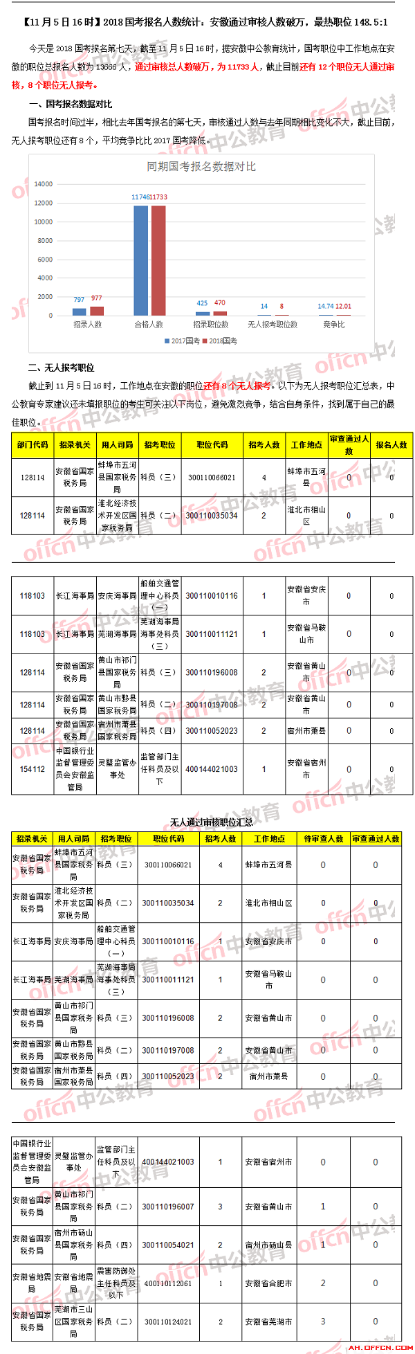【11月5日16時】2018國考報名人數(shù)統(tǒng)計:安徽通過審核總?cè)藬?shù)破萬,還有8個職位無人報考