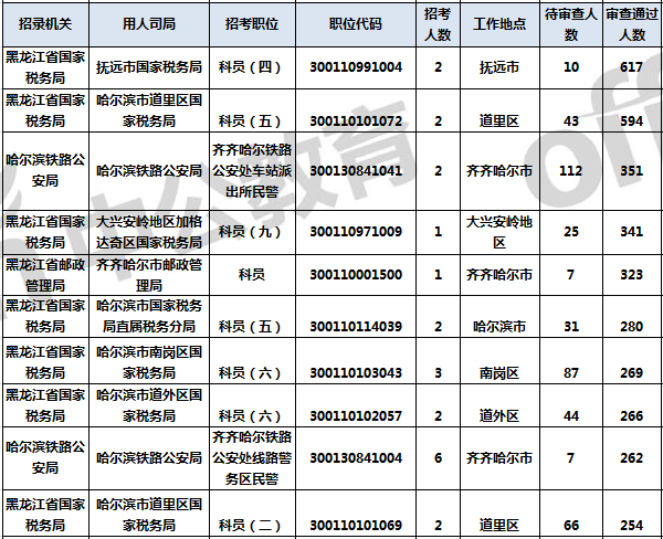 報名通過審核人數(shù)前十的職位主要集中在黑龍江省國家稅務(wù)局、哈爾濱鐵路公安局、黑龍江省郵政管理局等部門,具體信息如下: