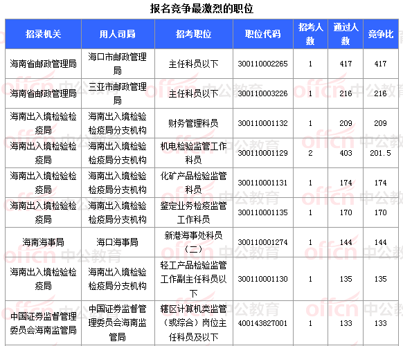 截止到6日16時,競爭比例的職位為海南省郵政管理局??谑朽]政管理局主任科員以下一職,招錄1人,截止到6日16時通過人數(shù)為417人。