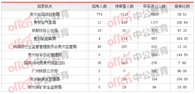 截止到5日16時(shí),報(bào)名人數(shù)及通過(guò)審核人數(shù)前三位的部門(mén)依次是:貴州省國(guó)家稅務(wù)局、貴州省氣象局、中國(guó)銀行業(yè)監(jiān)督管理委員會(huì)貴州監(jiān)管局,三部門(mén)報(bào)名人數(shù)達(dá)到41847人,占總報(bào)名人數(shù)的92.69%,通過(guò)審核總?cè)藬?shù)達(dá)32288人,占通過(guò)審核總?cè)藬?shù)的92.68%。