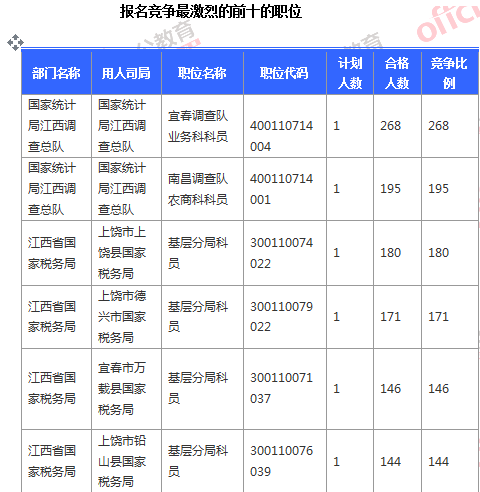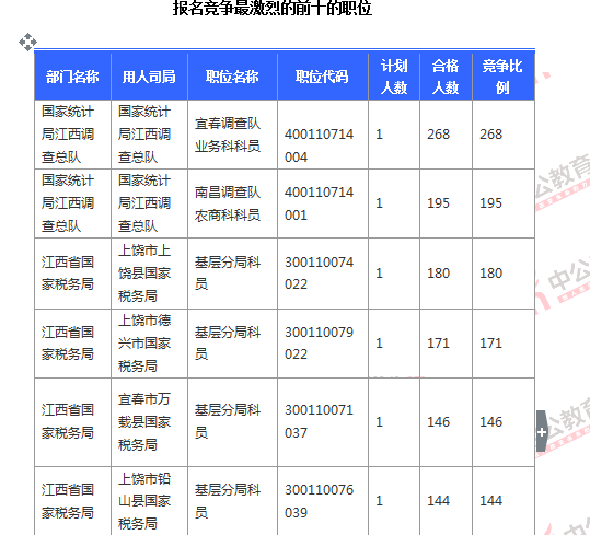 截止到6日16時(shí),競(jìng)爭(zhēng)比例的職位為國(guó)家統(tǒng)計(jì)局江西調(diào)查總隊(duì)國(guó)家統(tǒng)計(jì)局江西調(diào)查總隊(duì)宜春調(diào)查隊(duì)業(yè)務(wù)科科員一職,招錄1人,截止到6日16時(shí)通過(guò)人數(shù)為268人,位列第二的國(guó)家統(tǒng)計(jì)局江西調(diào)查總隊(duì)國(guó)家統(tǒng)計(jì)局江西調(diào)查總隊(duì)南昌調(diào)查隊(duì)農(nóng)商科科員一職,為195:1