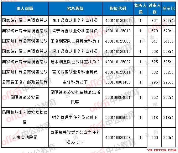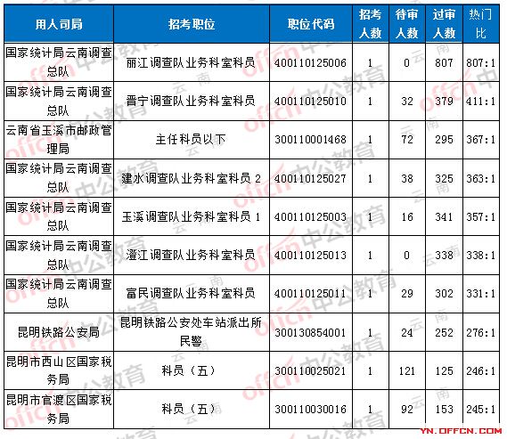 當前最受歡迎的崗位是國家統(tǒng)計局云南調(diào)查總隊,麗江調(diào)查隊業(yè)務科室科員,職位代碼:400110125006,招錄1人,807人報名,其中0人待審核通過,詳情如下圖: