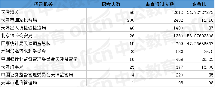 為幫助廣大考生更清晰的了解今日?qǐng)?bào)名情況,中公網(wǎng)校整理了審核通過(guò)人數(shù)前十位的部門以及競(jìng)爭(zhēng)比例最激烈的十大部門,供廣大考生參考: