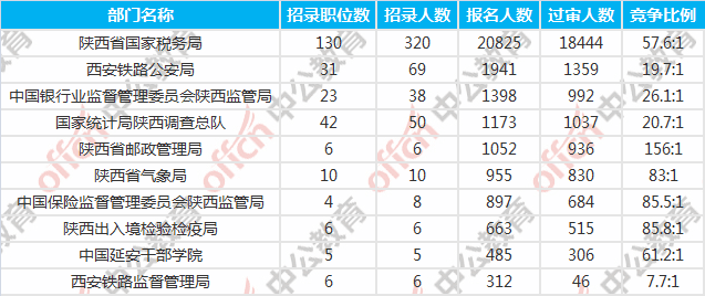 陜西國考報名競爭最激烈的十大部門
