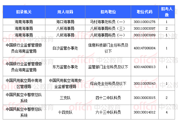 截止到7日16時(shí),工作地點(diǎn)在海南的職位共有8個(gè)無(wú)人報(bào)考,占全部職位的4.88%。下面是無(wú)人報(bào)考職位一覽表,中公網(wǎng)校專家建議廣大考生多關(guān)注一些較冷職位,避免激烈競(jìng)爭(zhēng),結(jié)合自身?xiàng)l件,找到屬于自己的職位。