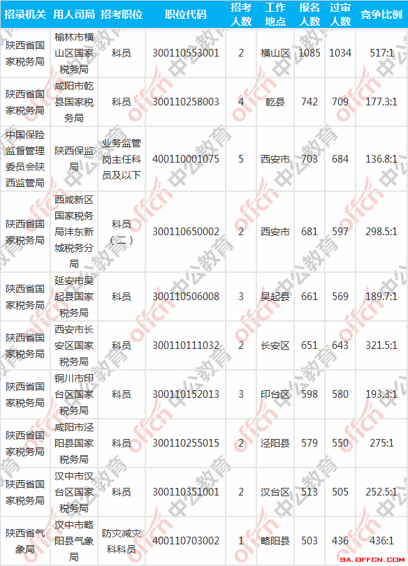 報名人數(shù)前十的職位主要集中在陜西省國家稅務(wù)局、中國保險監(jiān)督管理委員會陜西監(jiān)管局、陜西省氣象局等部門,具體信息如下: