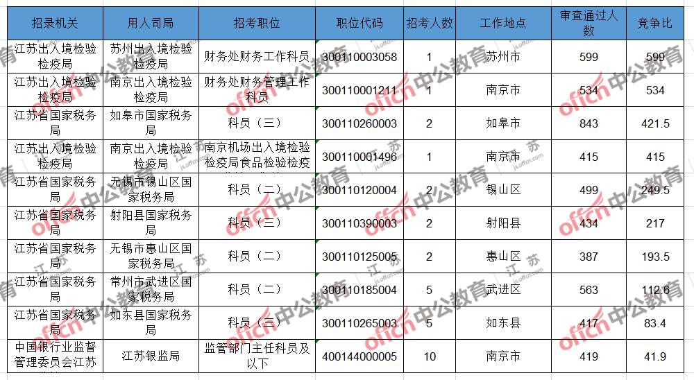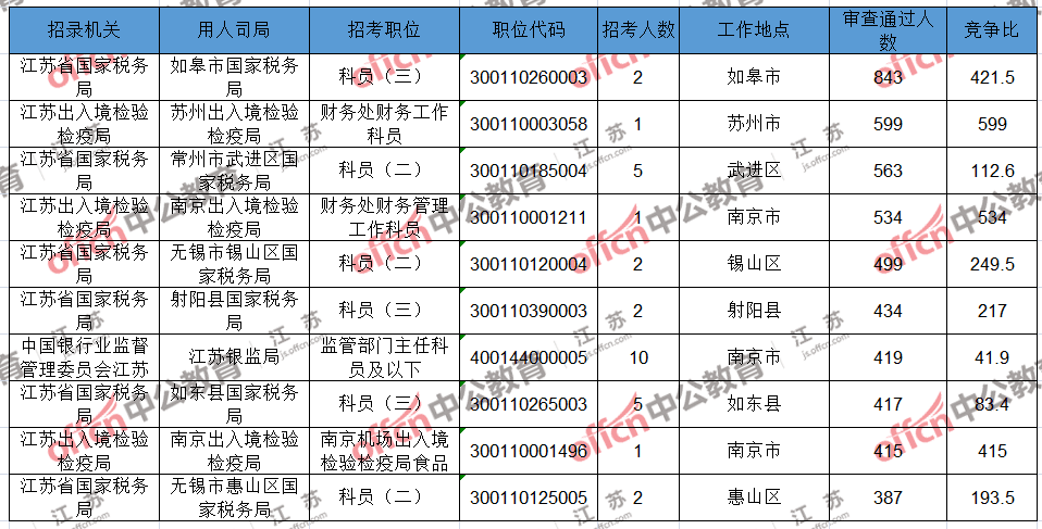 報名通過審核人數(shù)前十的職位主要集中在江蘇出入境檢驗檢疫局、江蘇省郵政管理局、江蘇省國家稅務(wù)局等部門,具體信息如下: