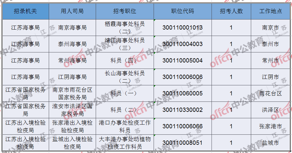 截止到6日16時(shí),工作地點(diǎn)在江蘇的職位共有8個(gè)無人報(bào)考,占全部職位的0.67%。下面是無人報(bào)考職位一覽表,中公網(wǎng)校專家建議廣大考生多關(guān)注一些較冷職位,避免激烈競爭,結(jié)合自身?xiàng)l件,找到屬于自己的職位。