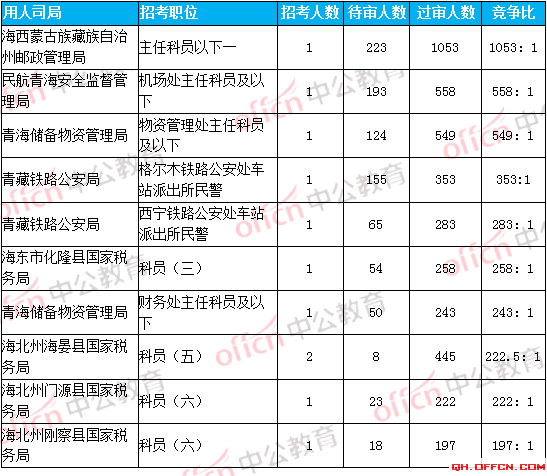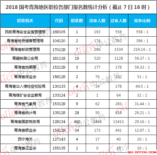 以下是7日16時(shí)各部門報(bào)名人數(shù)統(tǒng)計(jì)分析,其中中國(guó)民航青海安全監(jiān)督管理局、青海省物資儲(chǔ)備管理局、青海省郵政管理局等三個(gè)部門競(jìng)爭(zhēng)最激烈,競(jìng)爭(zhēng)比均已超過(guò)219:1。